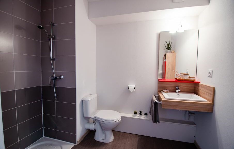 • Salle d’eau (douche), meuble vasque, miroir avec bandeau lumineux, WC