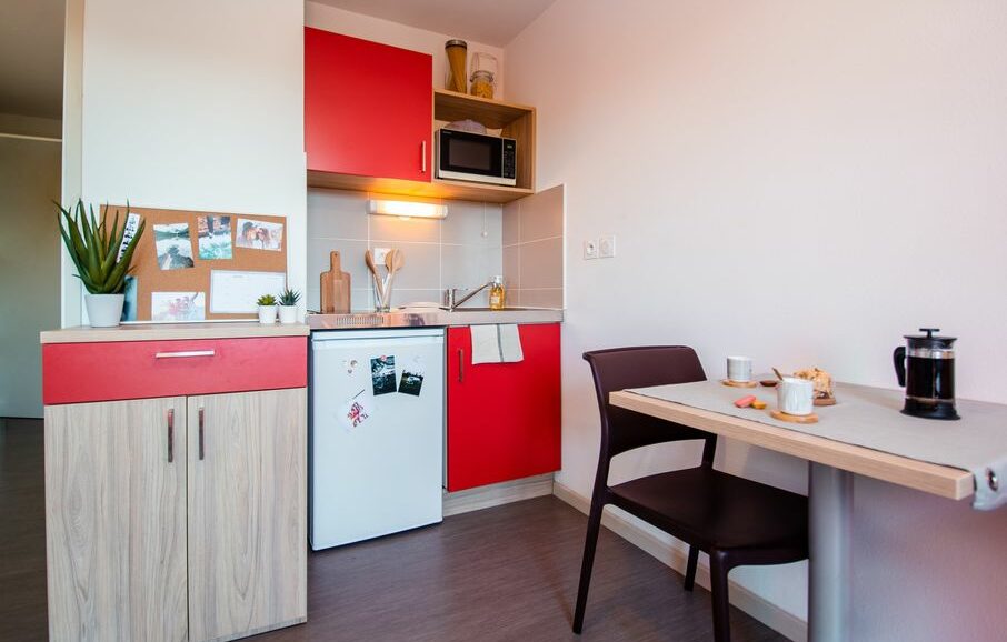 • Kitchenette équipée (évier, plaques vitrocéramiques, réfrigérateur, four à micro-ondes), table de cuisine, rangements, chaise…
