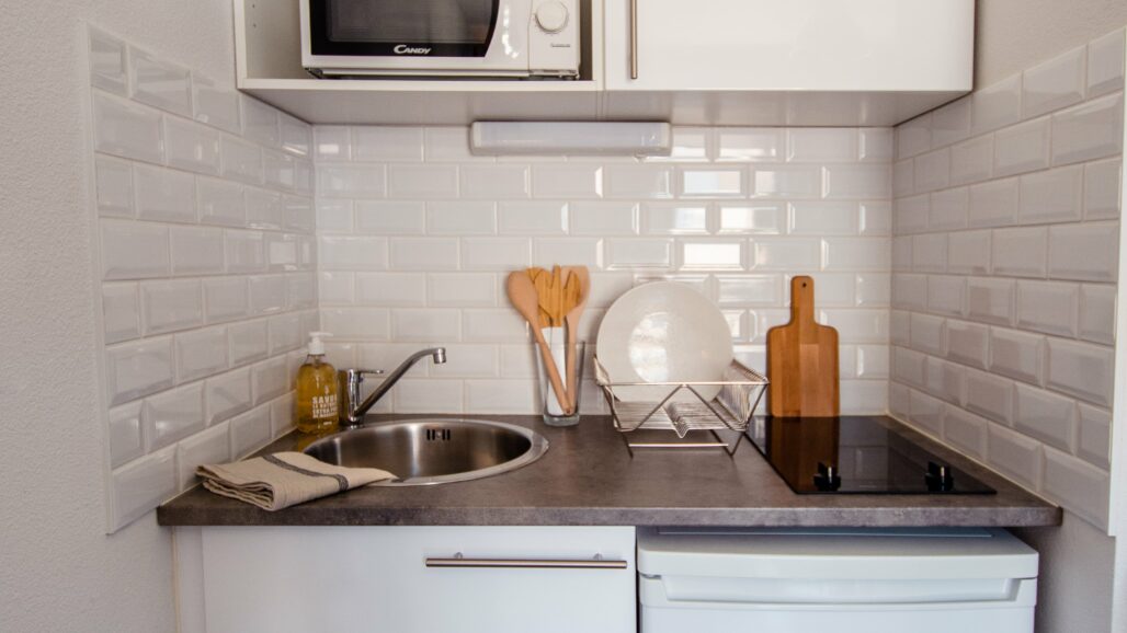 • Kitchenette équipée (évier, plaques vitrocéramiques, réfrigérateur, micro-ondes), table de cuisine, rangements, chaise…