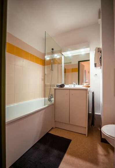 • Salle d’eau (baignoire ou douche), meuble vasque, miroir avec bandeau lumineux, WC